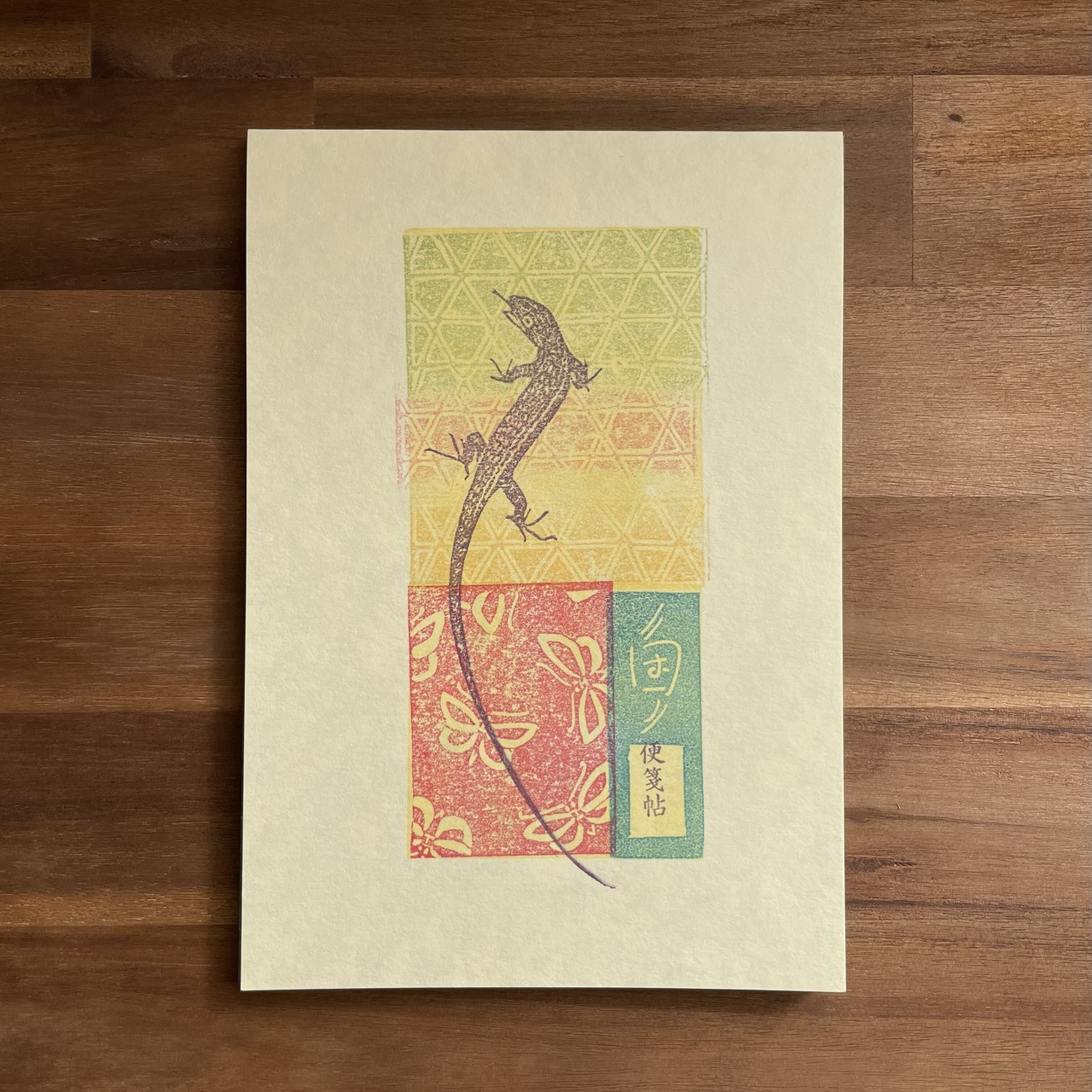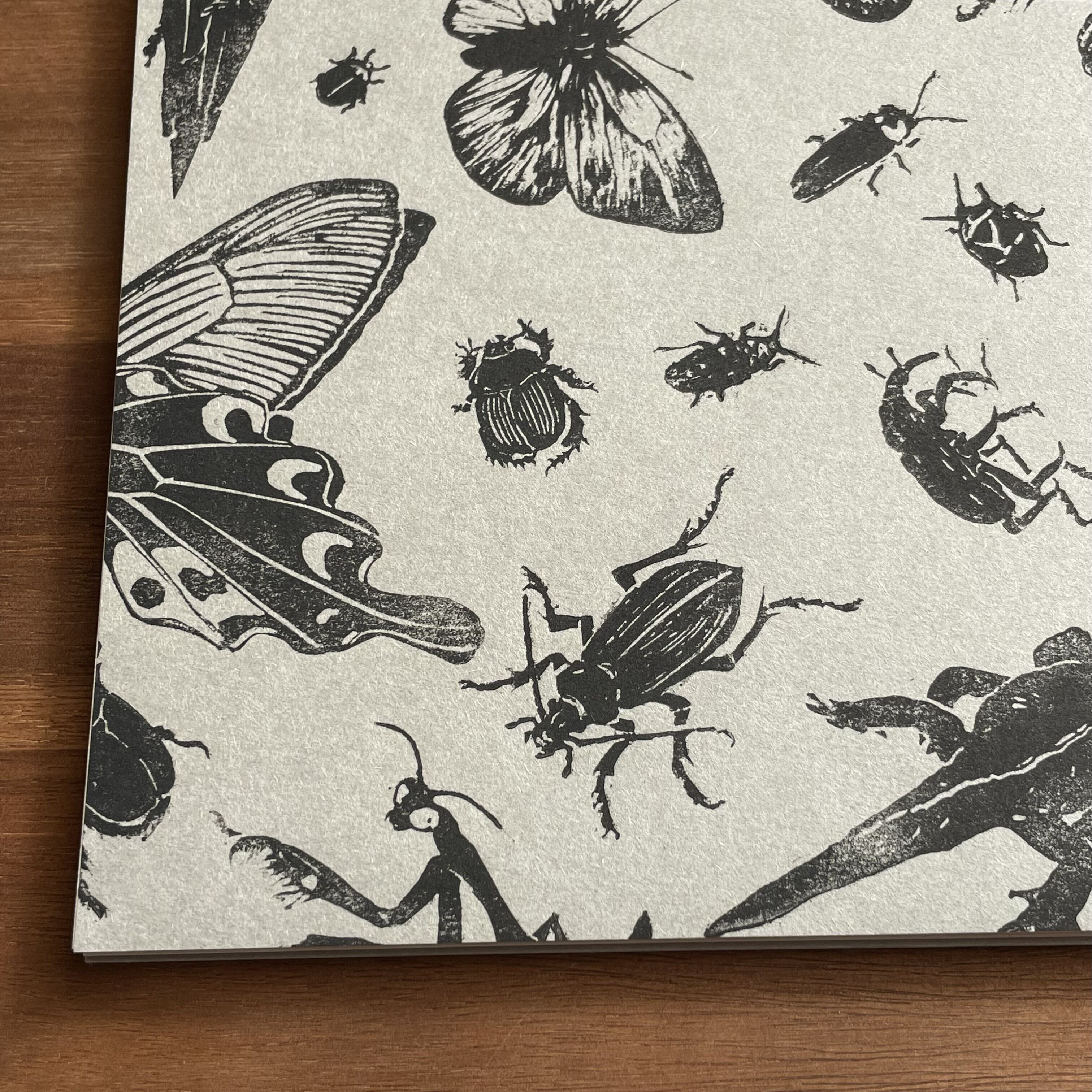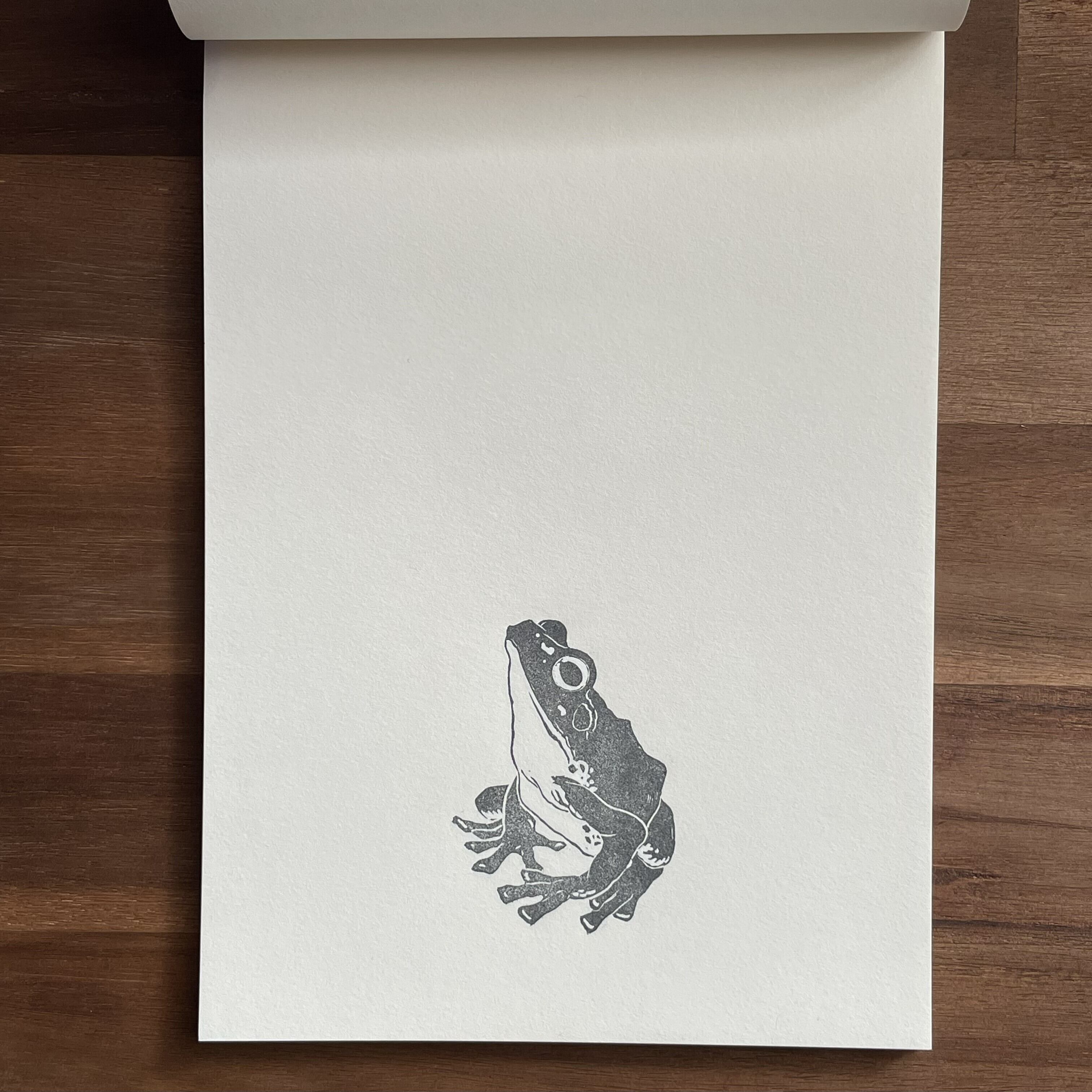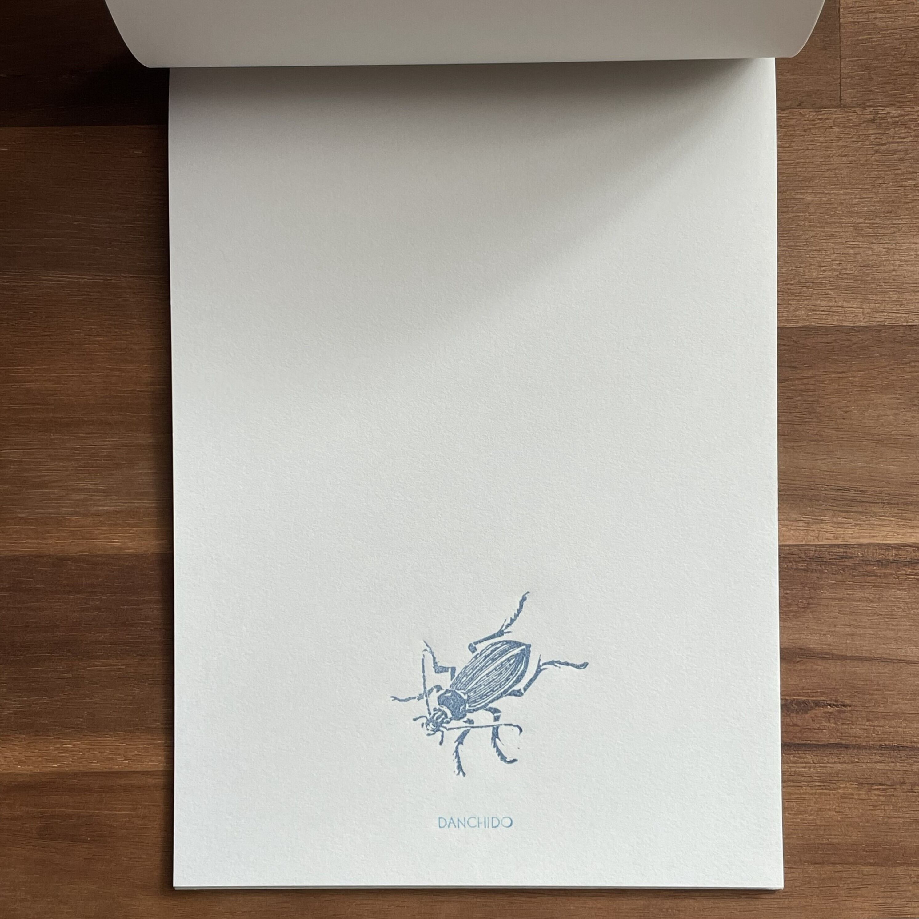様々な生き物を彫った版を用いて一枚ずつ手刷りして仕上げた便箋に、天面を糊付けし綴じました。