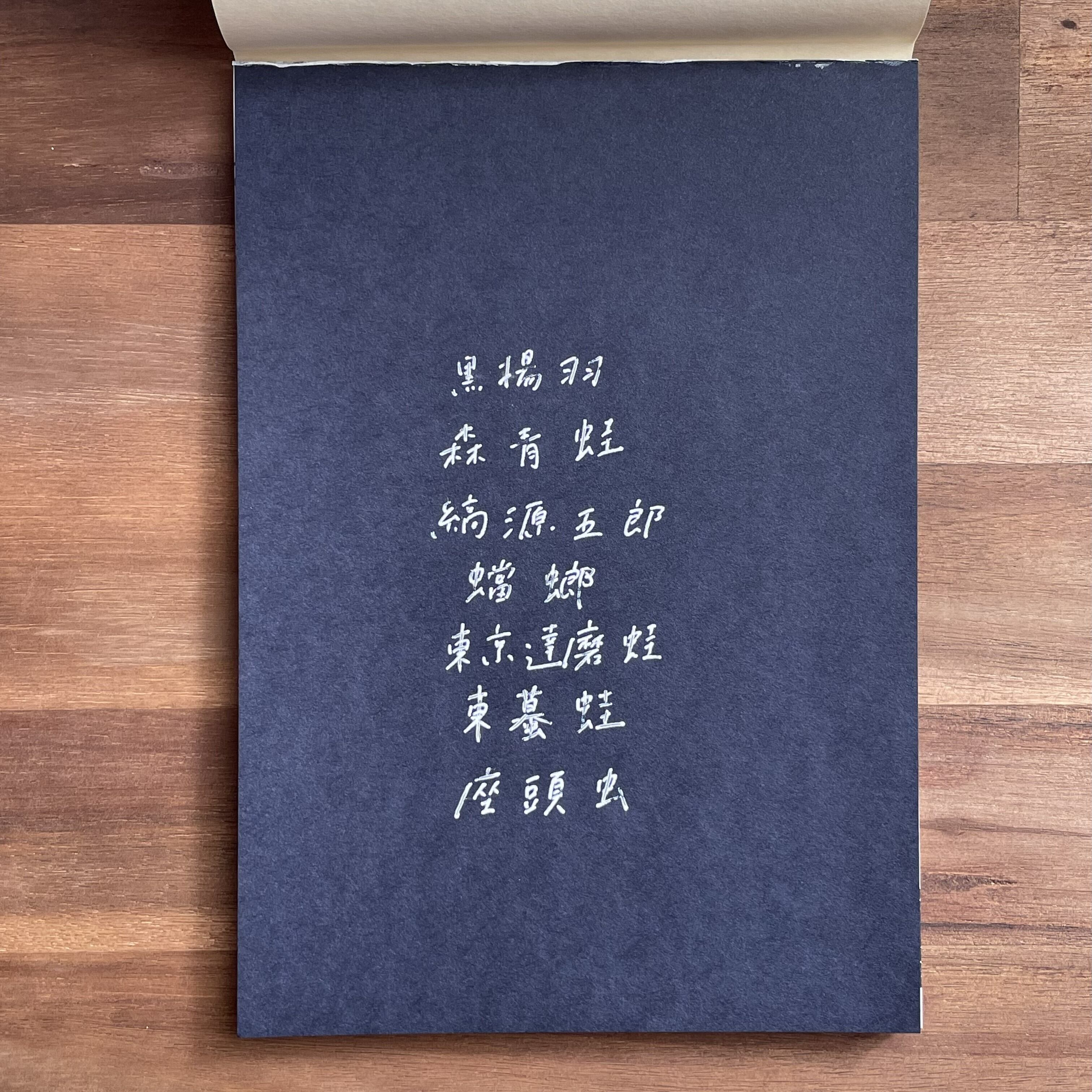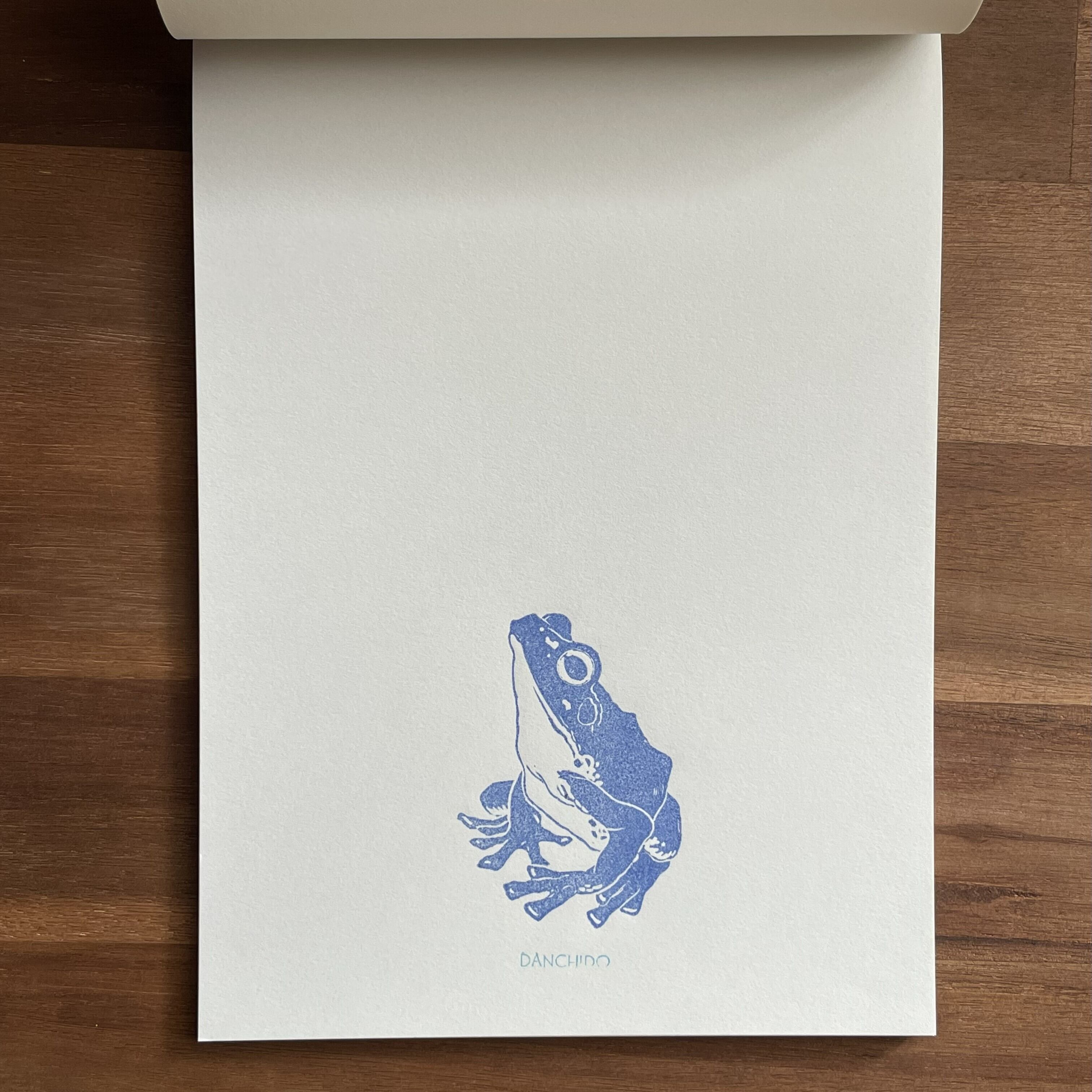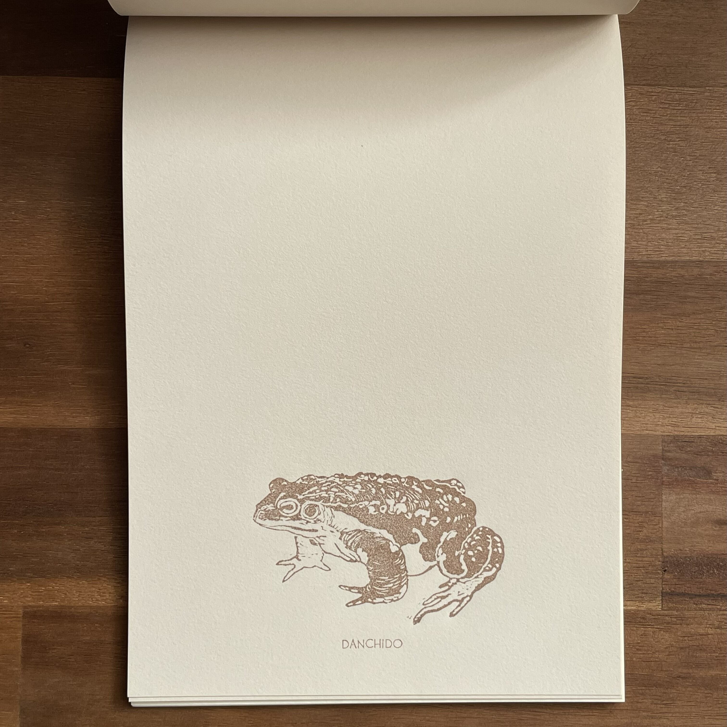 様々な生き物を彫った版を用いて一枚ずつ手刷りして仕上げた便箋に、天面を糊付けし綴じました。