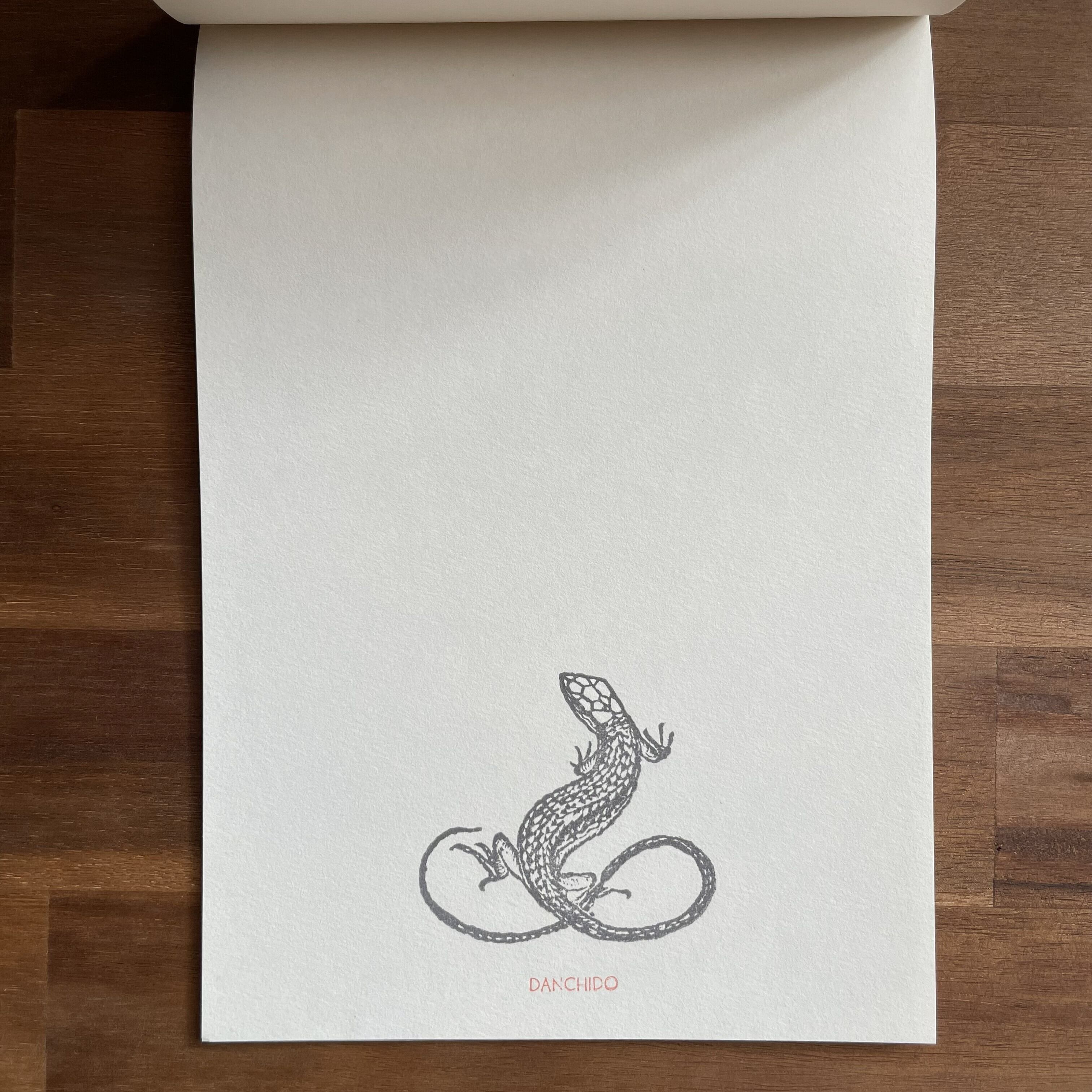 様々な生き物を彫った版を用いて一枚ずつ手刷りして仕上げた便箋に、天面を糊付けし綴じました。