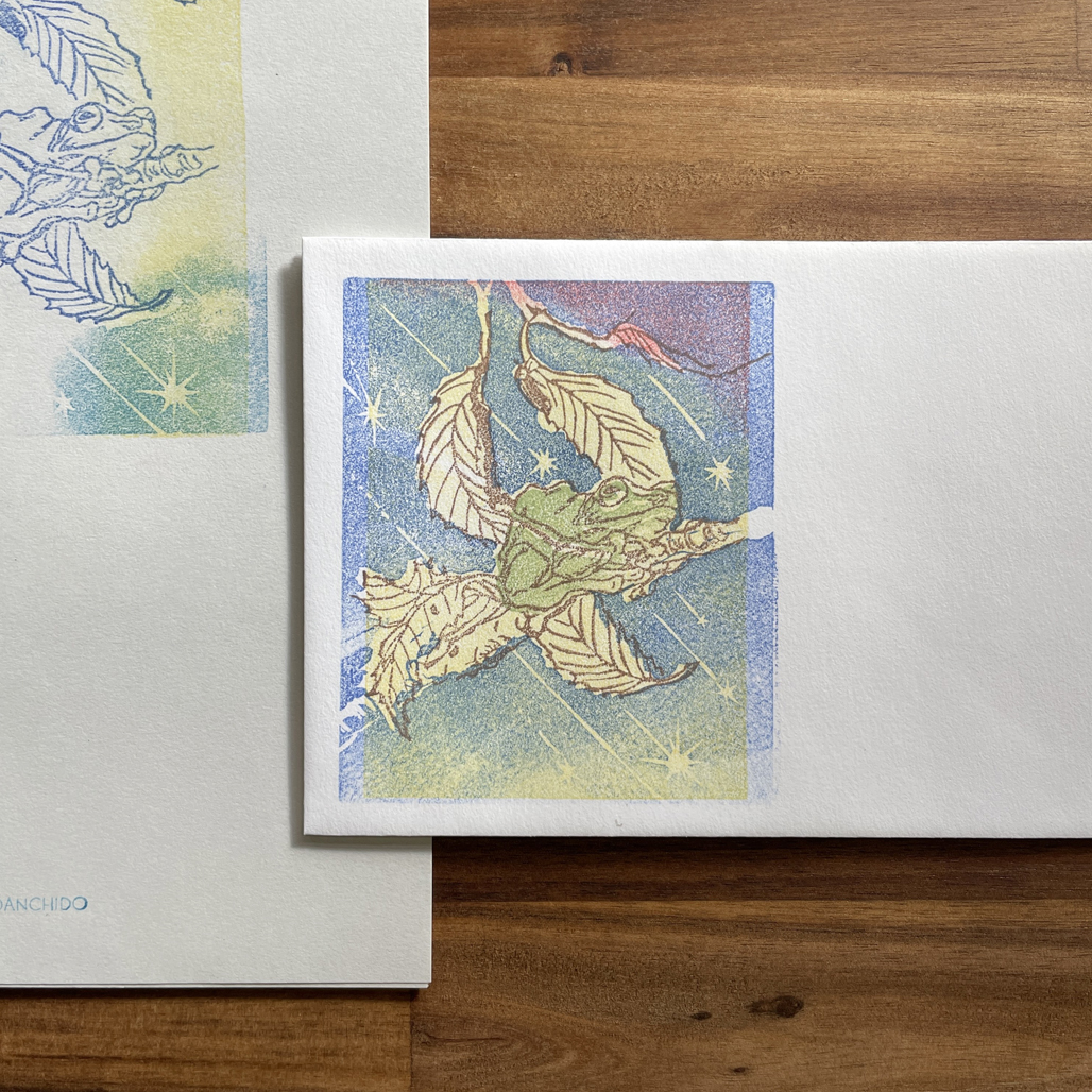 樹上で過ごすことの多いモリアオガエルが、夜空のもとに穏やかに煌びやかに佇む姿を思い描き、多色刷りで表現しました。