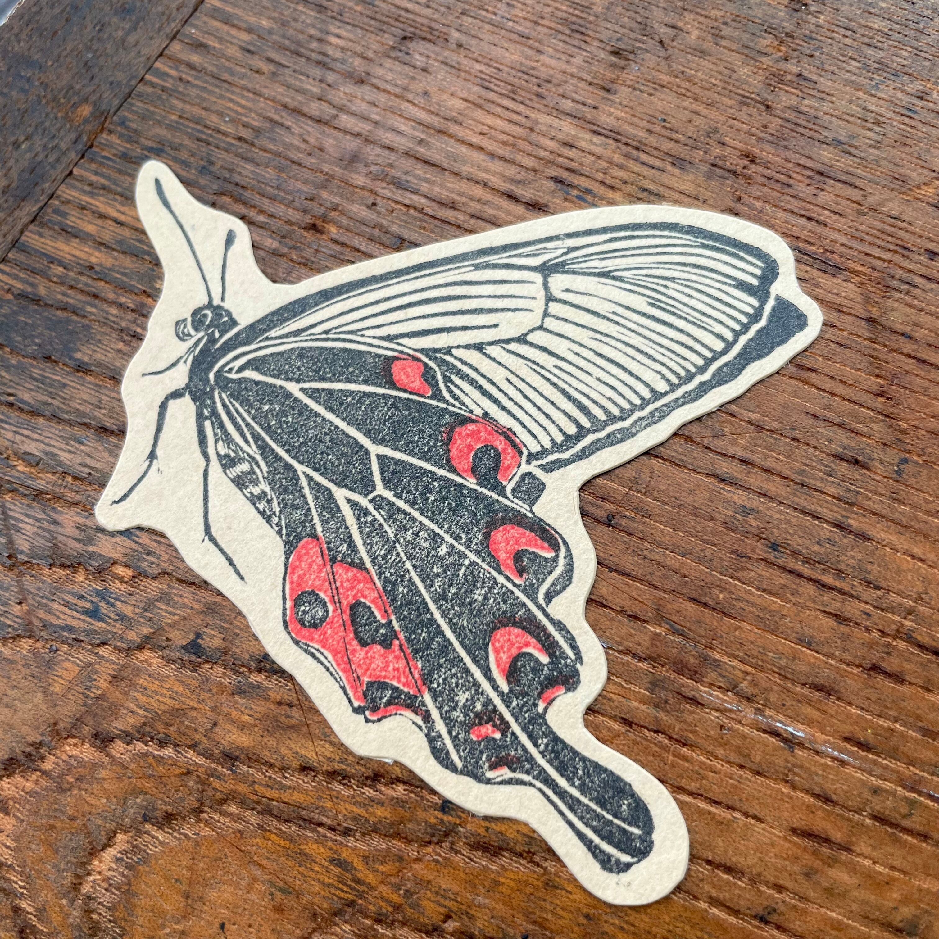 漆黒の翅に赤色が際立つその姿をあしらい、カットして栞にしました。